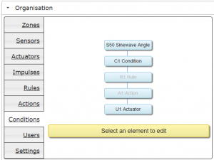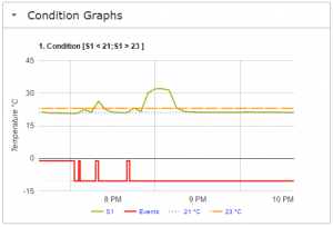 What you can do now with your test setup, is connect a lamp to the actuator relay to use as a heating element, and attach it to the temperature sensor. Change the condition to monitor the temperature sensor and set some suitable thresholds. You should see some more realistic activity in the Condition Graphs.
