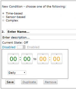 As significant effort had been put into the processing of conditions, rules and actions, I concluded this could be re-purposed for time-based conditions.  If you add a new Time-based condition you will see the following: